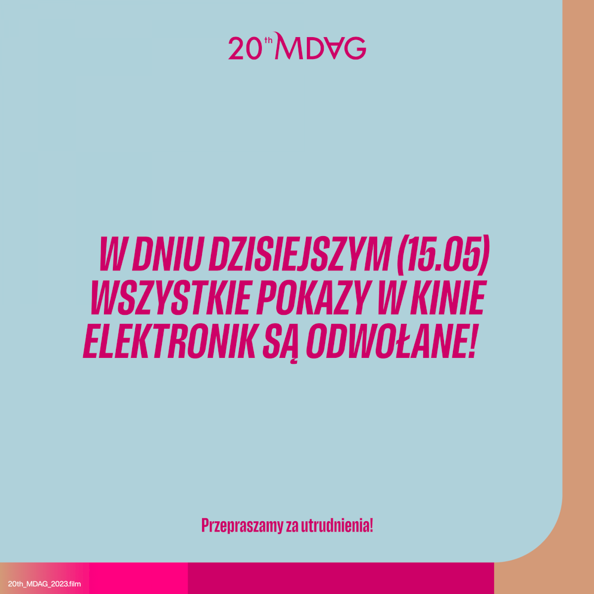 Z przykrością musimy odwołać wszystkie pokazy w dniu dzisiejszym (15.05) w Kinie Elektronik. Pokazy odbędą się w innym terminie, o czym poinformujemy w najbliższym czasie. Przepraszamy za utrudnienia!